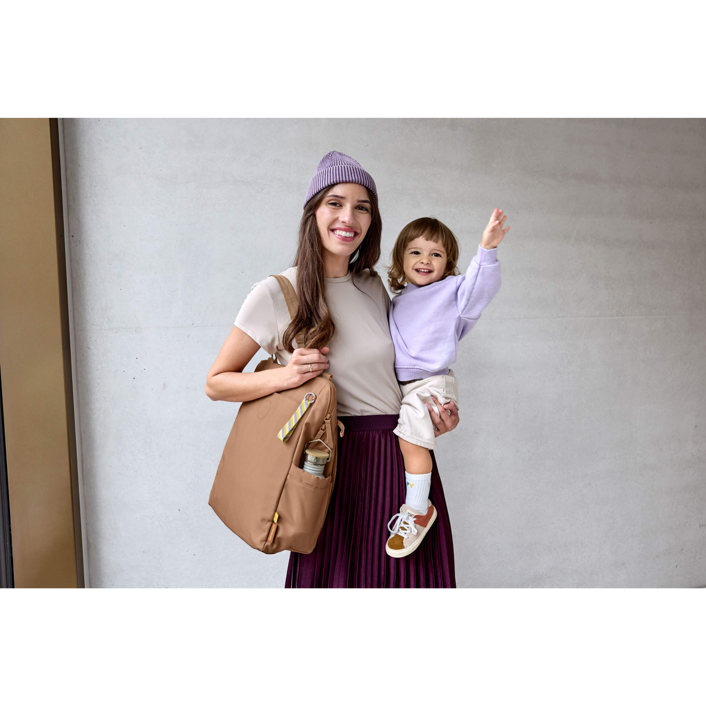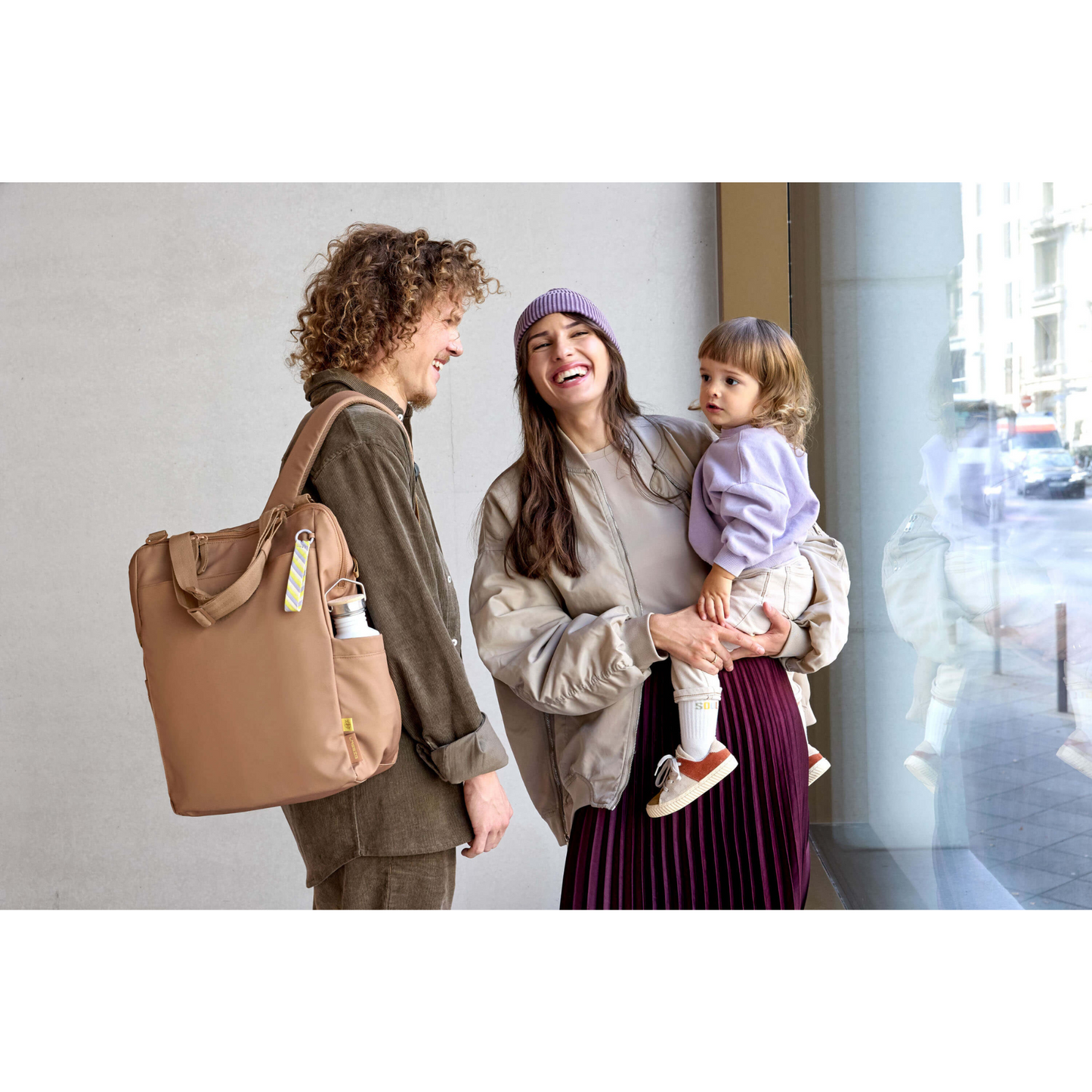 Ein Platzwunder im Arbeits - und Familienalltag: Der Wickelrucksack in Almond aus der Green Label Kollektion hat reichlich Stauraum, flexible Tragemöglichkeiten, praktisches Wickelzubehör, ein Laptop Fach (16 Zoll) und kann am Trolley befestigt werden