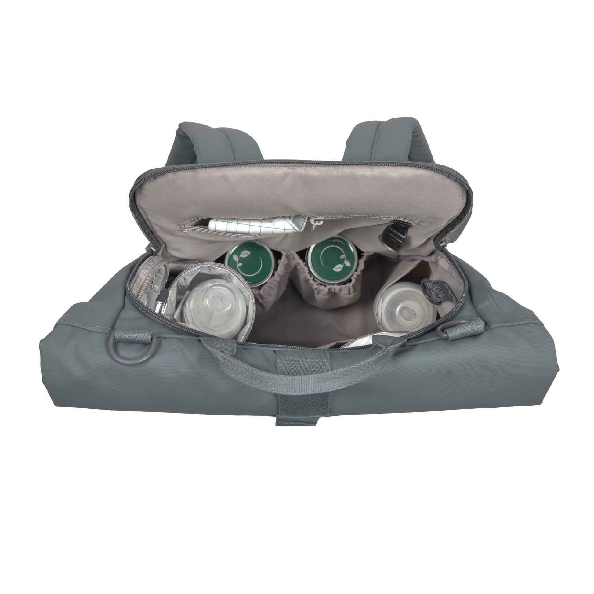 Ausgestattet mit einer wasserabweisenden Wickelunterlage, einem isolierten Flaschenhalter, einer Gläschenhalterung, einer Kinderwagenbefestigung und einer kleinen Utensilientasche hat man alles, was man unterwegs so braucht.